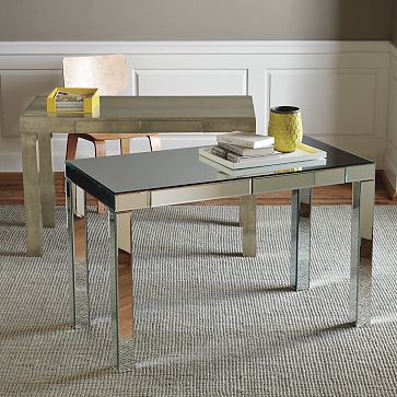We’ll now add a homework station for our straight “A” student. This beautiful mirrored desk and orange office chair from West Elm will be ideal. We’ll add three floating shelves above the desk for additional storage. Open storage may inspire organization….we’ll see.