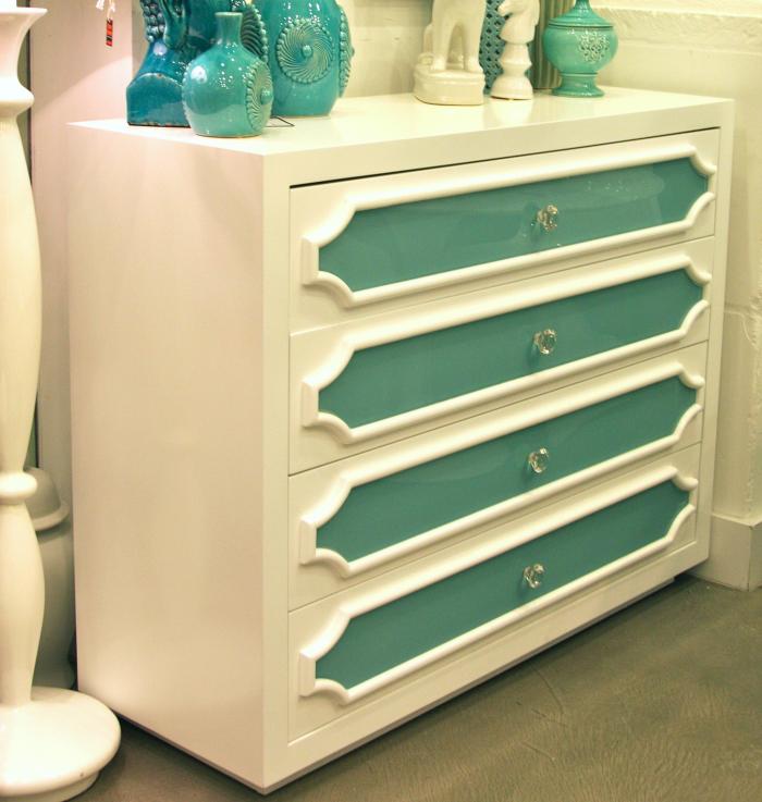 Next we’ll add a dresser for storage. This modern white and aqua dresser from Room Service is the perfect scale to allow for a seating area and a desk/homework area in the room.