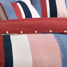 Next we’ll introduce the bedding. We’ll use this red and blue duvet and shams with the white patterned sheet set shown below. The yellow fabric will be made into a couple of pillows to add some contrast.