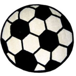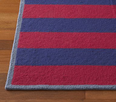 On to the most important area of the room, the video game and TV watching area. Even if there won’t be a TV in a kids bedroom, having an area to lounge and relax is still a great use of space. We’ll add a couple of rugs to ground the lounge area. This stripe rug from Pottery Barn Kids makes a bold statement. We’ll layer a small soccer ball rug on top to add some visual appeal